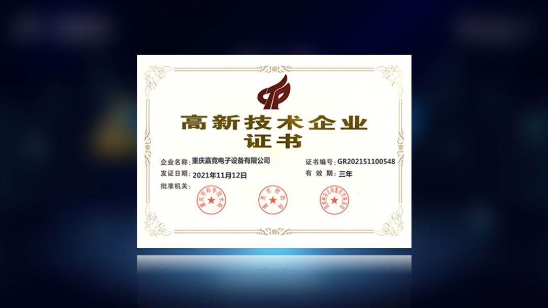 重慶嘉競電子設(shè)備有限公司獲高新技術(shù)企業(yè)證書